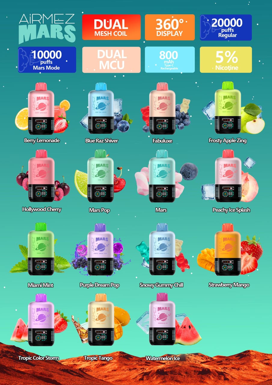 With a range of delicious flavors like Peachy Ice Splash, Miami Mint, Hollywood Cherry, and many more, the Airmez Mars 20000 Puffs Disposable Vape will enhance your vaping experience to the fullest.